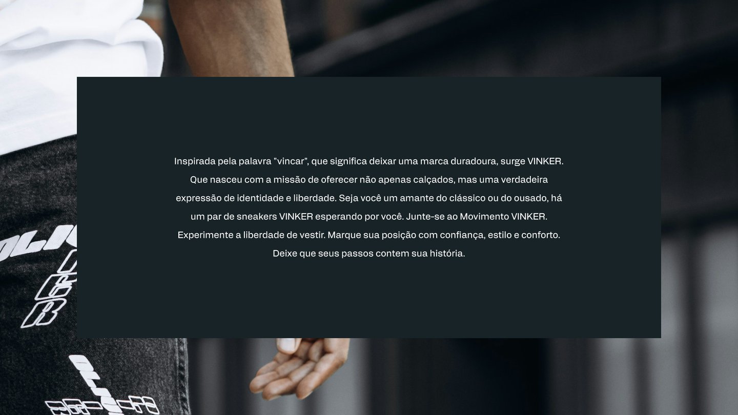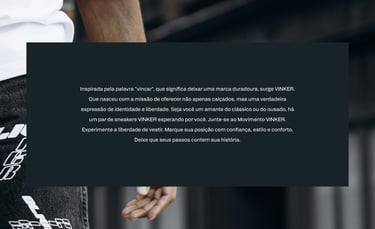 Inspirada pela palavra "vincar", que significa deixar uma marca duradoura, surge VINKER. Que nasceu com a missão de oferecer não apenas calçados, mas uma verdadeira expressão de identidade e liberdade. Seja você um amante do clássico ou do ousado, há um par de sneakers VINKER esperando por você. Junte-se ao Movimento VINKER. Experimente a liberdade de vestir. Marque sua posição com confiança, estilo e conforto. Deixe que seus passos contem sua história.